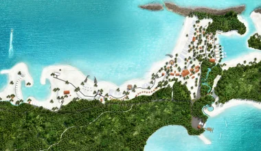 Súkromné ostrovy a pláže plavebných spoločností v Karibiku, Francúzskej Polynézii, v Arabskom mori ..