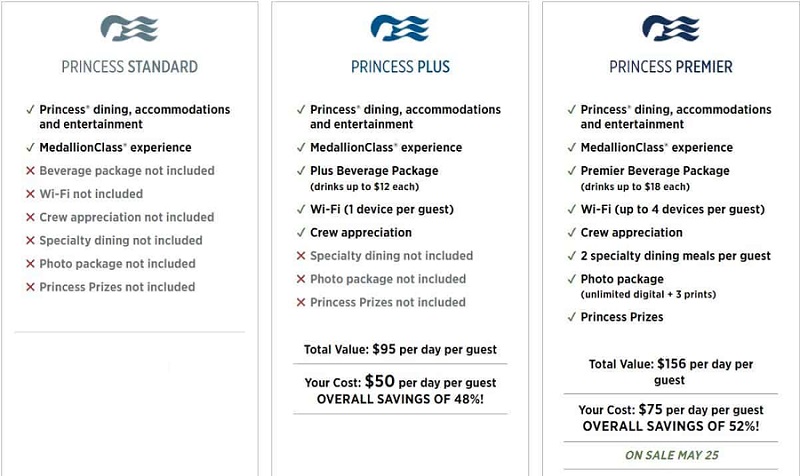 - Princess Plus (cena $50 na osobu a deň, od 25.5.2022) – zahrŕňa neobmedzenú WiFi pre 1 zariadenie; nápojový balíček Plus Beverage package (s nápojmi v hodnote $12, zľavu 25 % na fľaškové vína, kávové nápoje, smoothies a minerálka); prepitné pre personál