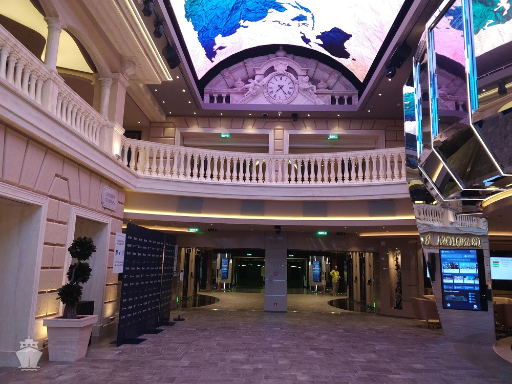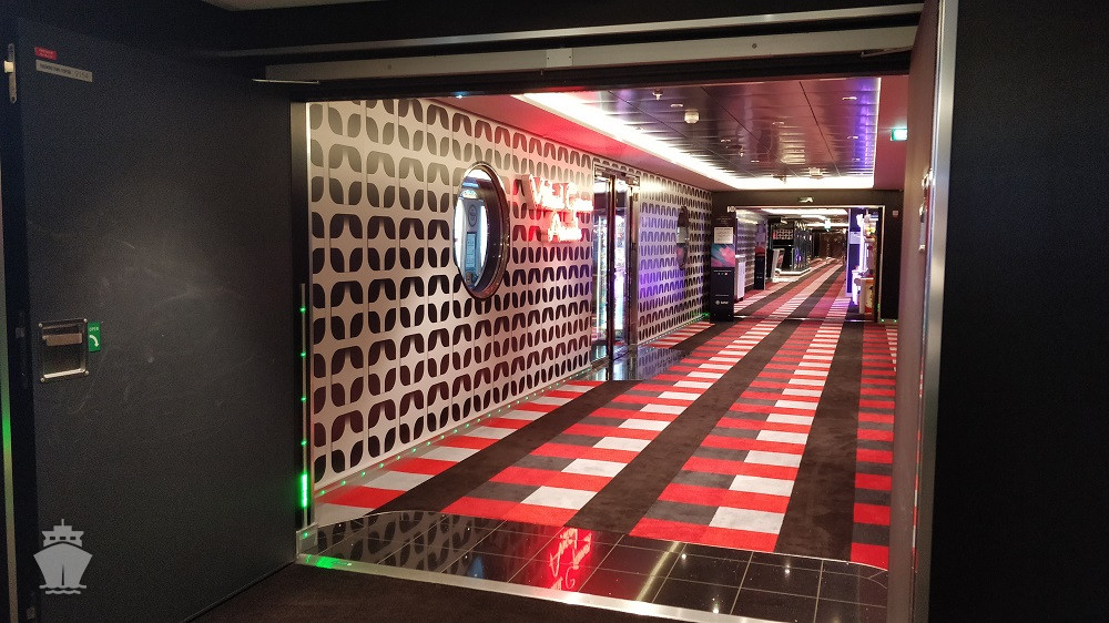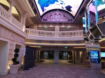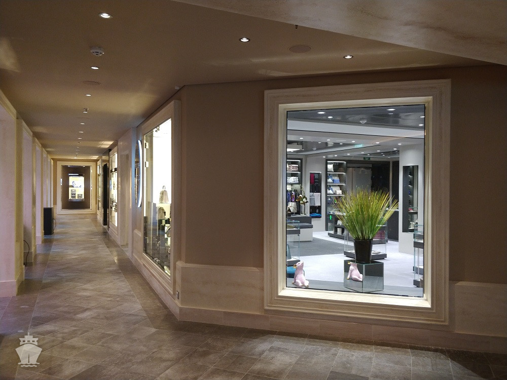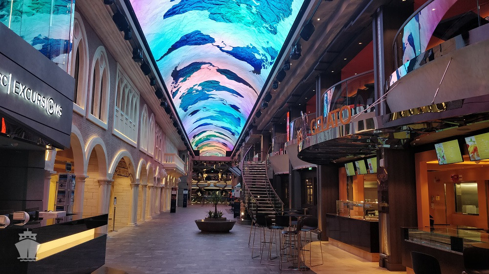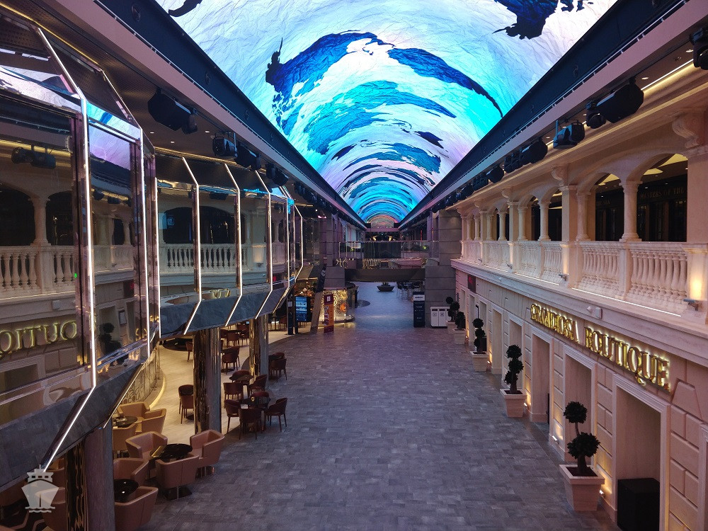 - Dvojúrovňová promenáda s reštauráciami, barmi a duty-free obchodmi, zastrešená 480 m² LED “digitálnou oblohou” s vizuálnymi show