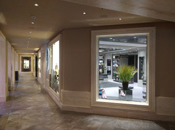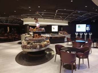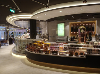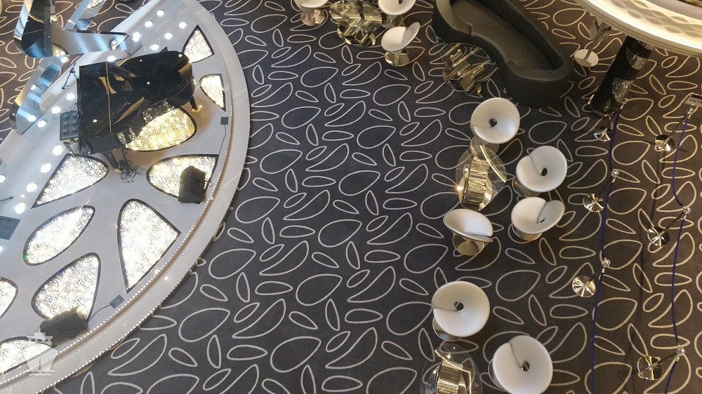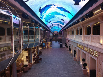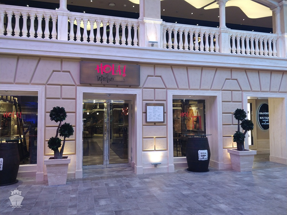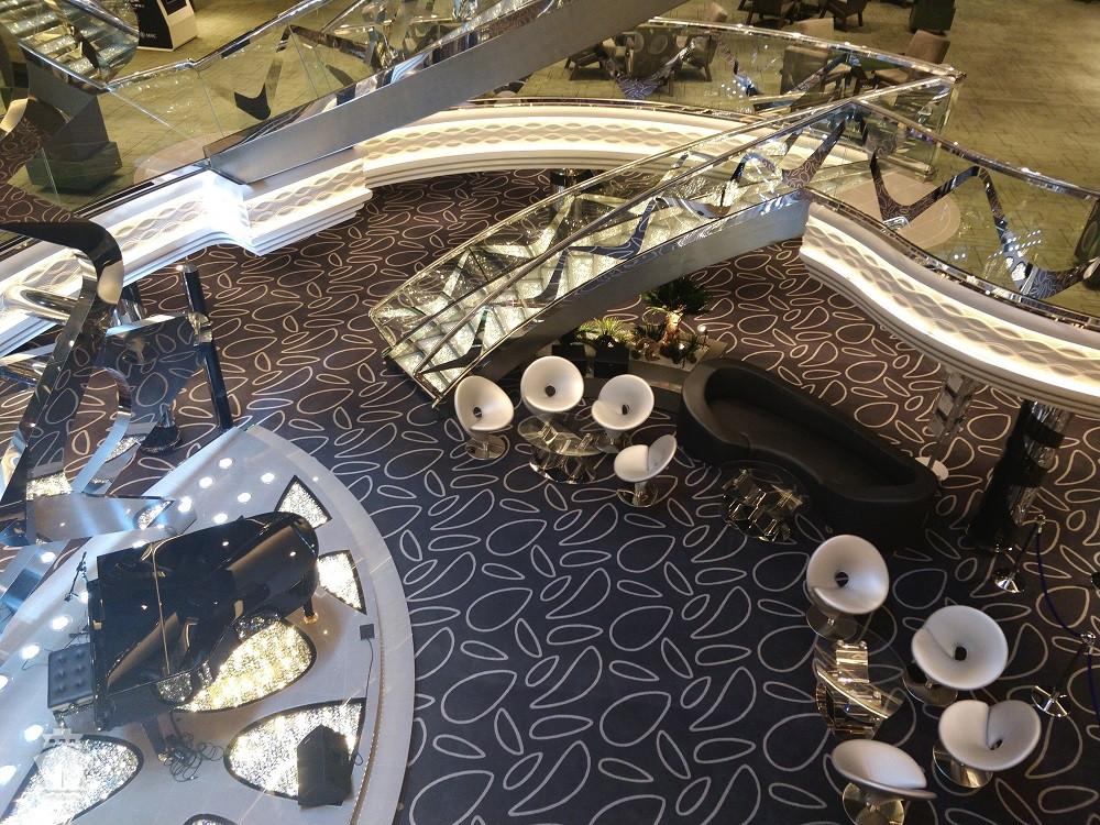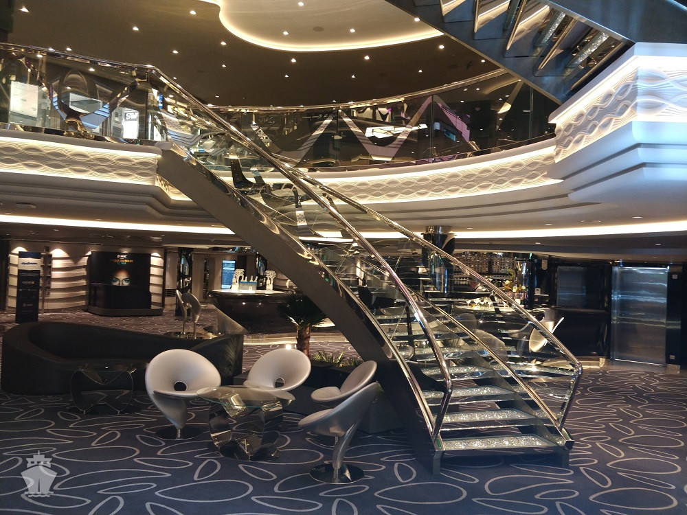- Dvojúrovňová promenáda s reštauráciami, barmi a duty-free obchodmi, zastrešená 480 m² LED “digitálnou oblohou” s vizuálnymi show