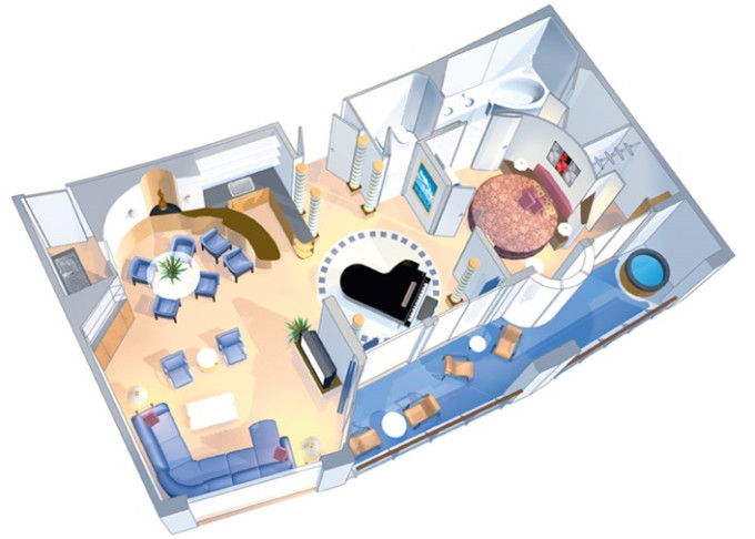 OS - Owner’s Suite s balkónom 47 m² + balkón s vírivkou 6 m². 10. paluba. Max 4 osoby. Výhody Suite. 6 432 € 6 432 € za osobu