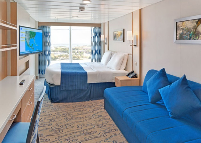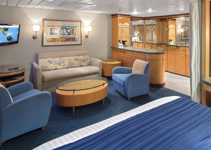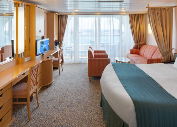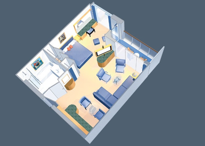 VP - Ocean View Panoramic Suite (bez balkónu) 37 m². Panoramatické neotvárateľné okná.12. paluba - vpredu. Max 6 osôb. Výhody Royal Suite Class. 4 842 € 4 842 € za osobu