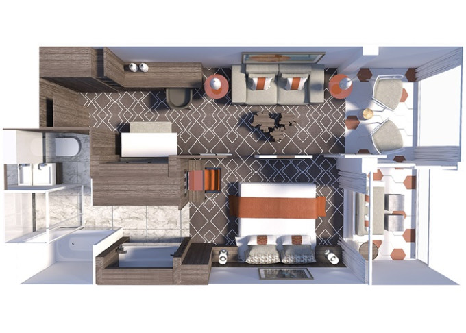 CS - Celebrity Suite 43 m² + balkón 5 m². 11,12. paluba. Max 4 osoby. Výhody Suite. | 8 607 € 8 607 € za osobu |