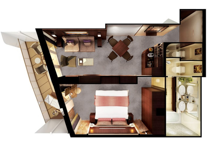 | M1 - Club Suite Aft-facing 47 m² / balkón 19 m². 10. paluba - vzadu. Max 2 osoby. Výhody Club. | 5 904 € 2 952 € za osobu |