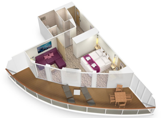 JA - Junior-Suite s balkónom PREMIUM 34 m² + terasa 27,5 m². 8. až 15. paluba. Max 4 osoby. Cenový model Premium + výhody Junior Suite. | 6 740 € 3 370 € za osobu |