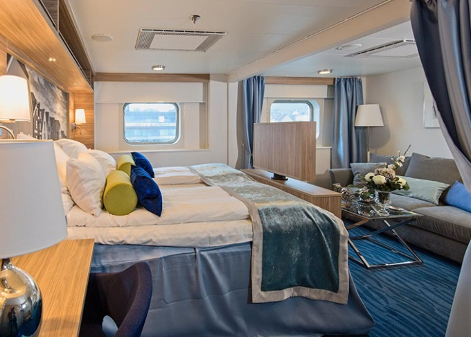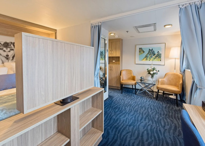 Q4 - Expedition Mini Suite 22 m². Neotvárateľné okno. Obývacia časť, Tv, Wi-Fi, župany, deka, varná kanvica, minibar. 6. paluba. Max 4 osoby. Výhody Suite. | 8 464 € 4 232 € za osobu | ||