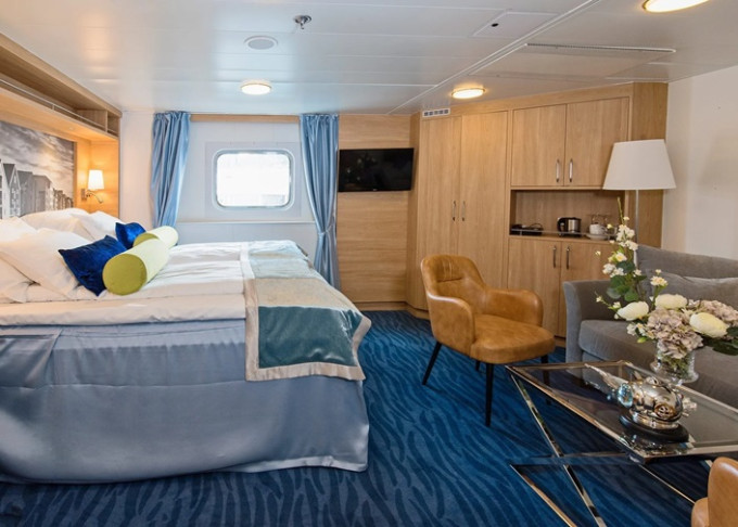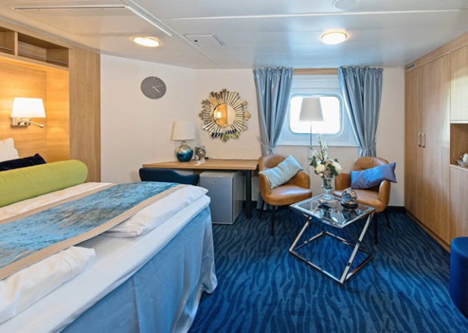 | M4 - Expedition Suite 28-30 m². Panoramatické neotvárateľné okno. Obývacia časť, oddelená spálňa, Tv, WiFi, minibar, varná kanvica. 6. paluba. Max 4 osoby. Výhody Suite. | 10 244 € 5 122 € za osobu | ||