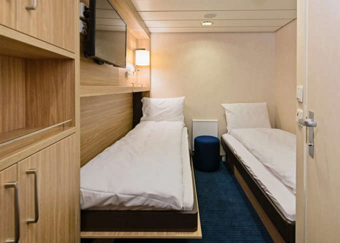 J2 - Vonkajšia kajuta Polar 8 -9 m². Neotvárateľné okno s obmedzeným výhľadom. Oddelené postele, Tv. 5,6. paluba. Max 2 osoby. 4 016 € 2 008 € za osobu