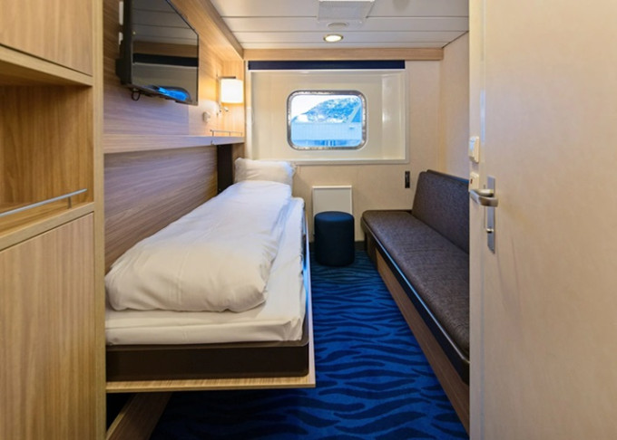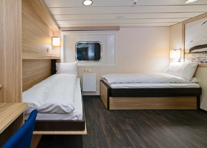 P2 - Vonkajšia kajuta Arctic Superior 10-11 m². Neotvárateľné okno. Oddelené postele alebo manželská, Tv, varná kanvica. 5. paluba. Max 2 osoby. 5 174 € 2 587 € za osobu