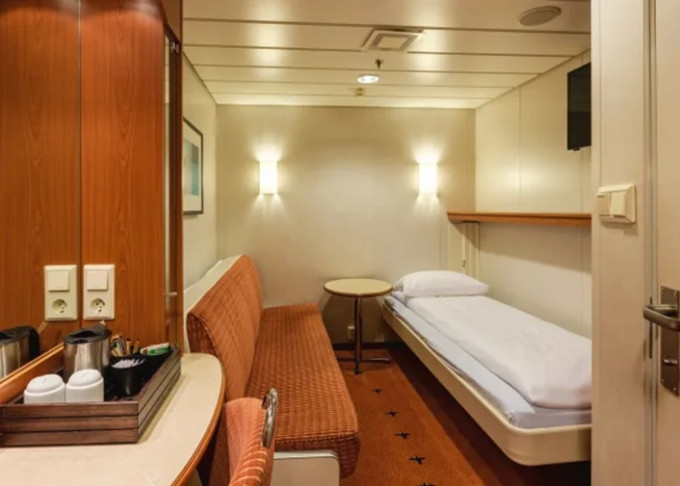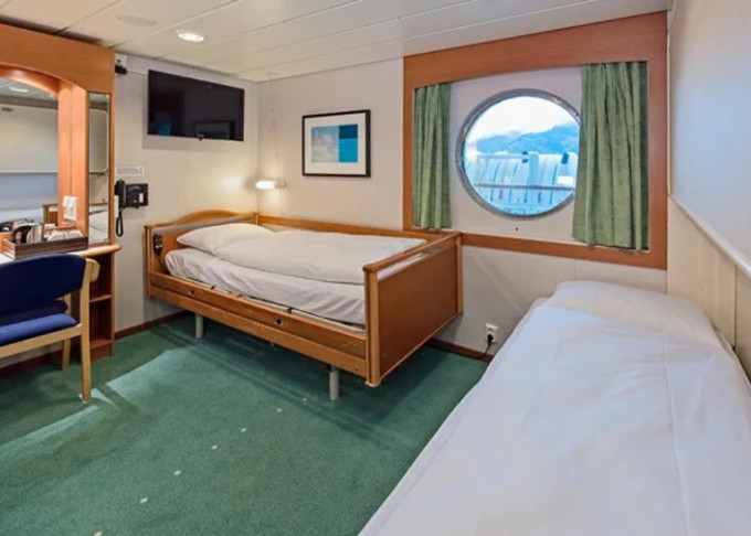 Kajuty na 7. a 8. palube, s 2 lôžkami spojiteľnými do manželskej postele; varnou kanvicou a TV.