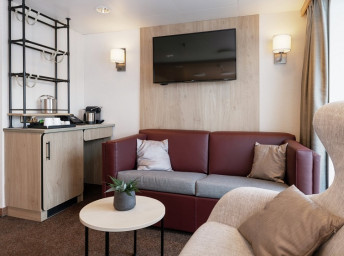 M4 - Expedition Suite s balkónom 19-22 m². Balkón. Manželská posteľ, rozkladací gauč, Tv, safe, župany a papuče, kávovar a varná kanvica, minibar. 6. paluba. Max 4 osoby. Výhody Suite. | 19 840 € 9 920 € za osobu | ||