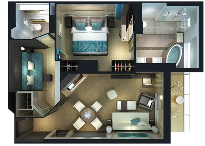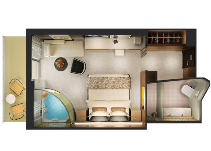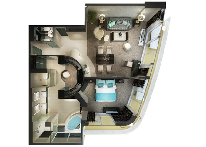 M1 - Club Suite Aft-facing 47-54 m² / balkón 19-25 m². 10. paluba - vpredu.Max 2 osoby. Výhody Club. | 2 092 € 1 046 € za osobu |