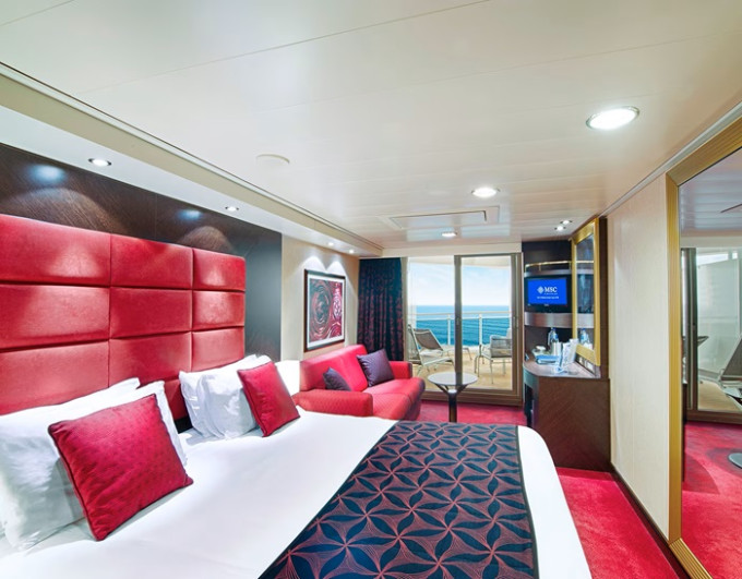 Suite s balkónom/panoramatickým oknom: 21-47m², kajuta s manželskou posteľou (na požiadanie 2 oddelené postele) a rozkladacia pohovka. Klimatizácia, kúpeľňa s vaňou, toaletný stolík, priestranná skriňa, interaktívna TV, telefón, minibar, sejf, sušič na vlasy. Balkón so stolíkom a stoličkami/panoramatické okno. Internetové pripojenie (za poplatok).