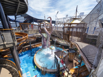 Bazén Long Island Pool na 18. palube - s 360 stupňovým fontánovým ostrovom. Je prepojený s tematickým aquaparkom Pirates Cove.