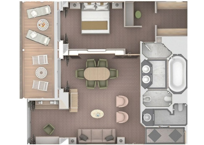 O1 - Owner's Suite 1 88 - 98 m² (vrátane balkóna 12 m²). 9. paluba - stred. Max 3 osoby. 62 200 € 62 200 € za osobu