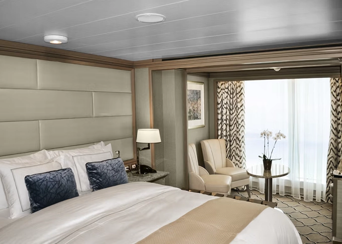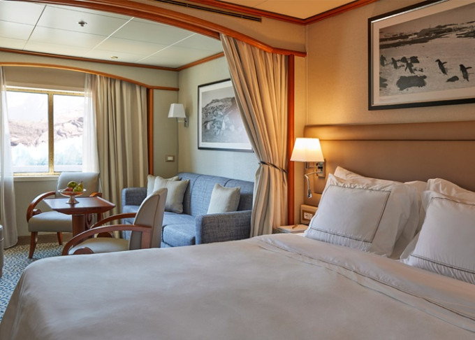 VI - Vista Suite s oknom 32 m². Panoramatické neotvárateľné okno. 4. paluba. Max 2 osoby. 18 800 € 9 400 € za osobu