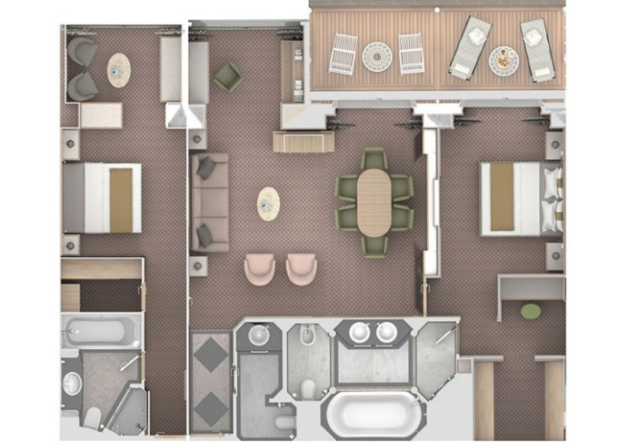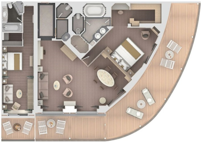 O2 - Owner's Suite 2 119 - 129 m² (vrátane balkóna 12 m²). Owners Suite S1 spojená s Panorama Suite PA 9. paluba - stred. Max 5 osôb. 105 300 € 35 100 € za osobu