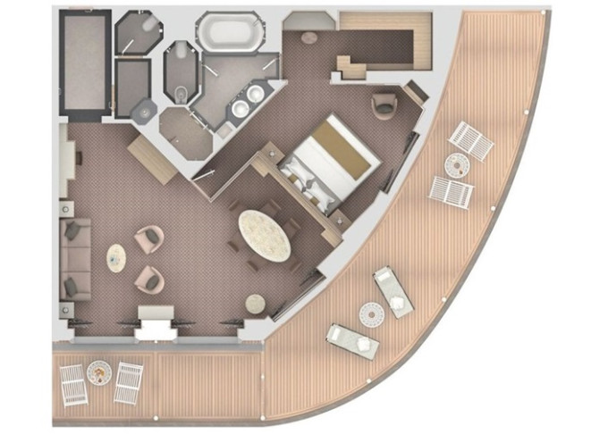 O1 - Owner's Suite 1 88 - 98 m² (vrátane balkóna 12 m²). 9. paluba - stred. Max 3 osoby. 62 200 € 31 100 € za osobu