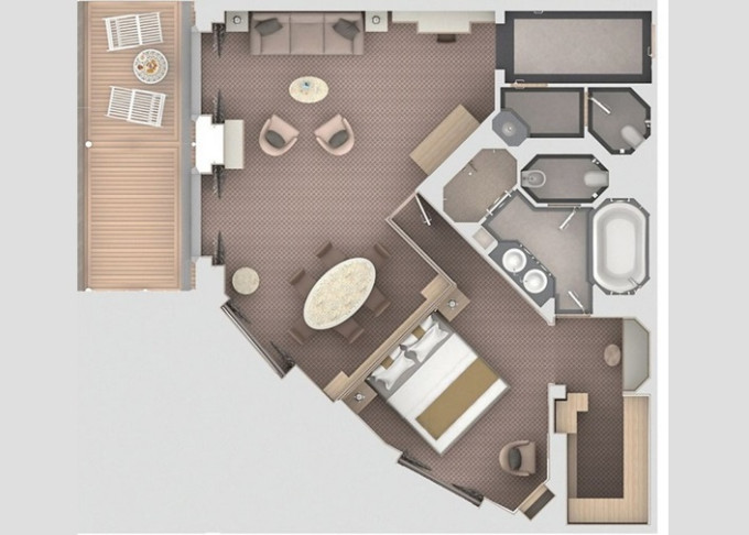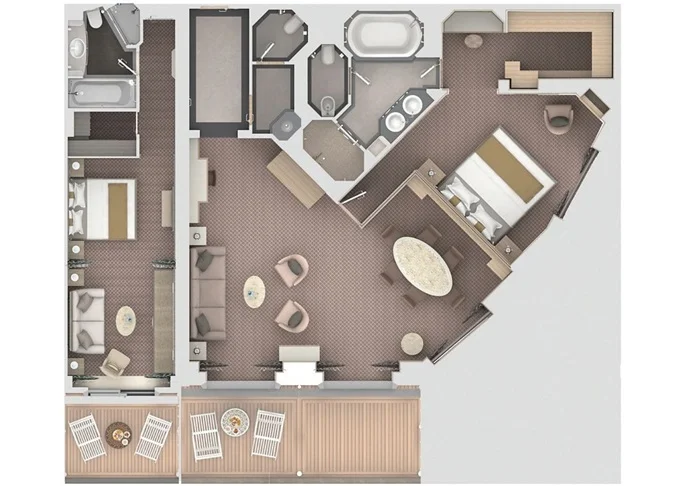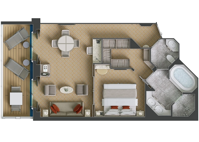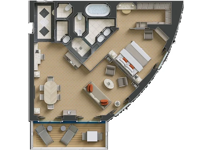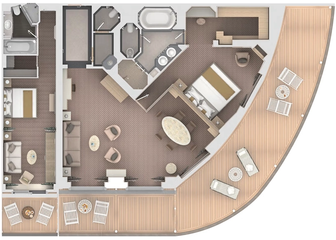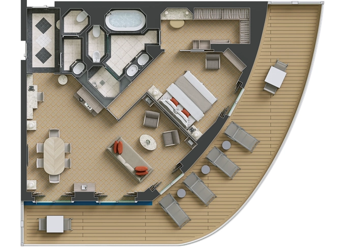 R1 - Royal Suite 1 105 m² (vrátane balkónu). 7. paluba vpredu. Max 3 osoby. 41 600 € 41 600 € za osobu