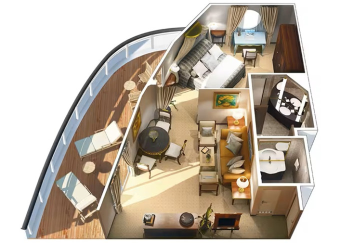 VS - Vista Suite 50 m² + rohový balkón s vírivkou 23 m². 6,7. paluba vpredu. Max 2-4 osoby. Spálňa, predelená obývacia a jedálenská časť, onyxová kúpeľňa so sprchovacím kútom a vírivkou, extra wc. Výhody Vista Suite. | 18 278 € 9 139 € za osobu |