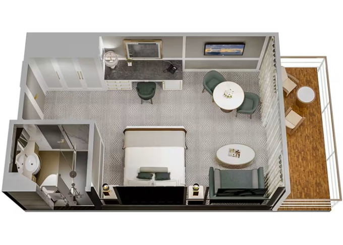PH1 - Penthouse Suite 23 m² + balkón 6 m². 8. paluba stred. Max 2-3 osoby. Spálňa s obývacou časťou, kúpeľňa so sprchovacím kútom. Výhody Penthouse Suite. | 13 078 € 6 539 € za osobu |