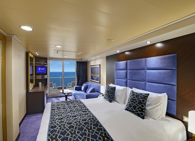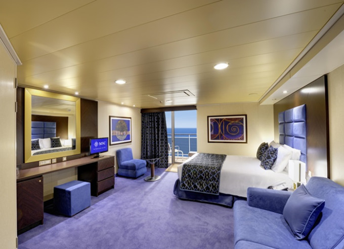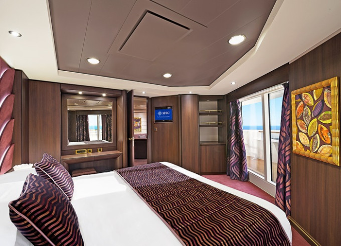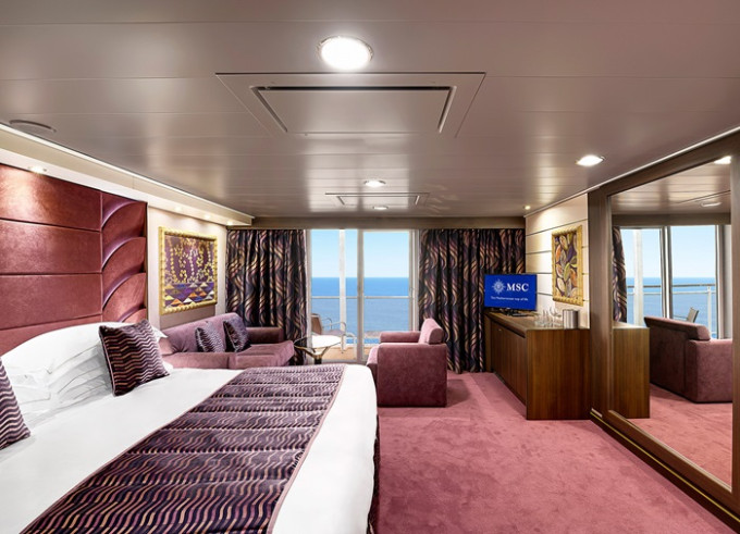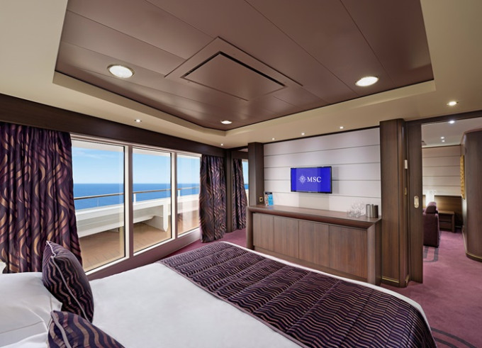 Suite s balkónom/panoramatickým oknom: cca32 m², (Royal, Family, Aurea 47-52m²) kajuta s manželskou posteľou (na požiadanie 2 oddelené postele) a rozkladacia pohovka. Klimatizácia, kúpeľňa s vaňou, toaletný stolík, priestorná skriňa, interaktívna TV, telefón, minibar, sejf, sušič na vlasy. Balkón so stolíkom a stoličkami alebo panoramatické okno. Internetové pripojenie (za poplatok).
