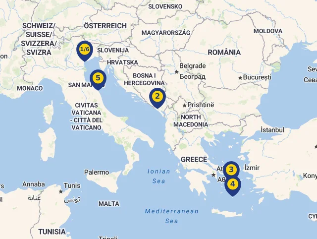 Spoznajte miesta, kde Vaša loď počas plavby zakotví! Každá zastávka je označená číslom, ktoré zodpovedá jej pozícii na mape, aby ste mohli jednoducho sledovať celú trasu. Stačí kliknúť na vybranú destináciu a zistíte viac o každej z nich. Pre ešte lepší prehľad si môžete celý program plavby prezrieť priamo na mape.