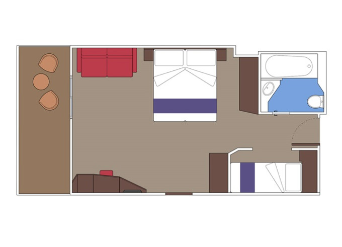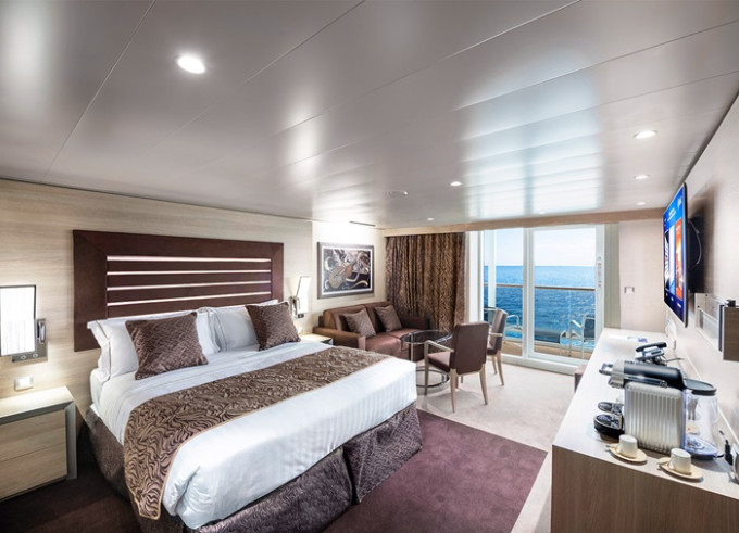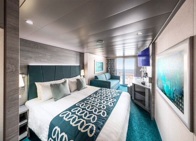 Balkónová kajuta: 19 - 22 m², kajuta s manželskou posteľou (na požiadanie 2 oddelené postele) a rozkladacia pohovka. Klimatizácia, kúpeľňa so sprchou alebo vaňou a WC, toaletný stolík, priestranná skriňa, interaktívna TV, telefón, trezor, sušič vlasov, virtuálna asistentka ZOE. Balkóny so stolíkom a stoličkami. Niektoré kajuty majú obmedzený výhľad.