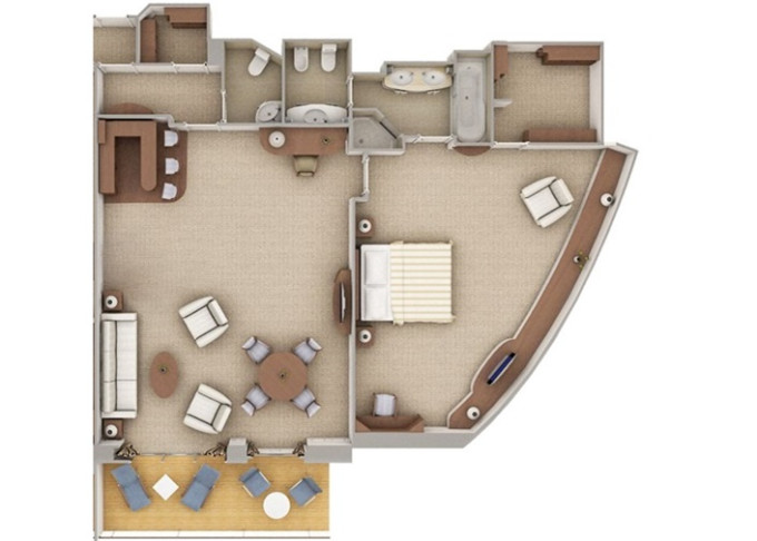 O2 - Owner's Suite 2 117 m² (vrátane balkóna 20 m²). Owners Suite O1 spojená s Vista Suite. 7. paluba stred. Max 5 osôb. | 197 600 € 49 400 € za osobu |