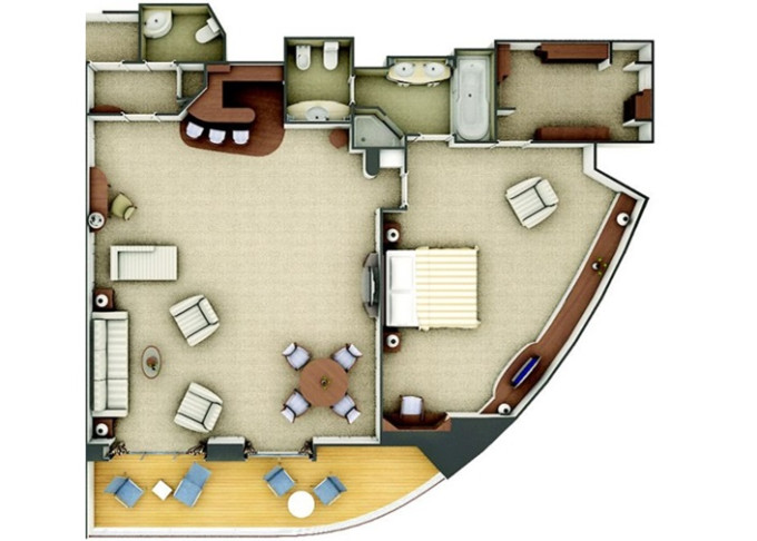 O2 - Owner's Suite 2 117 m² (vrátane balkóna 20 m²). Owners Suite O1 spojená s Vista Suite. 7. paluba stred. Max 5 osôb. | 148 200 € 49 400 € za osobu |
