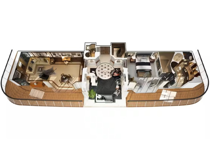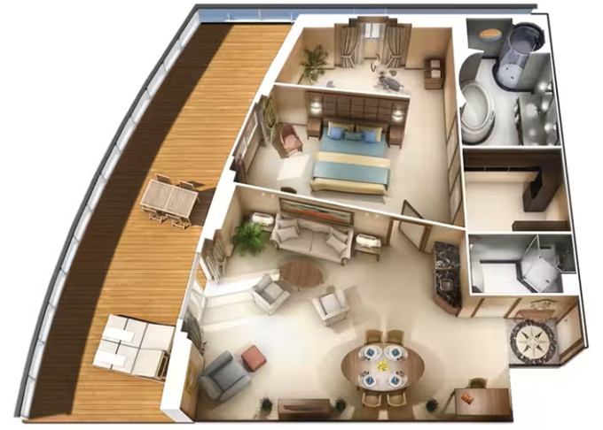 OS - Owner’s Suite 123 m² + balkón od 62 m². 8. až 10. paluba vzadu. Max 2-3 osoby. 4 izby: vstupná hala s pianom, spálňa, veľká obývacia miestnosť s jedálenskou časťou, 2 kúpeľne (1 s vírivkou), 2 šatníky. Výhody Owners Suite. | 33 058 € 16 529 € za osobu |