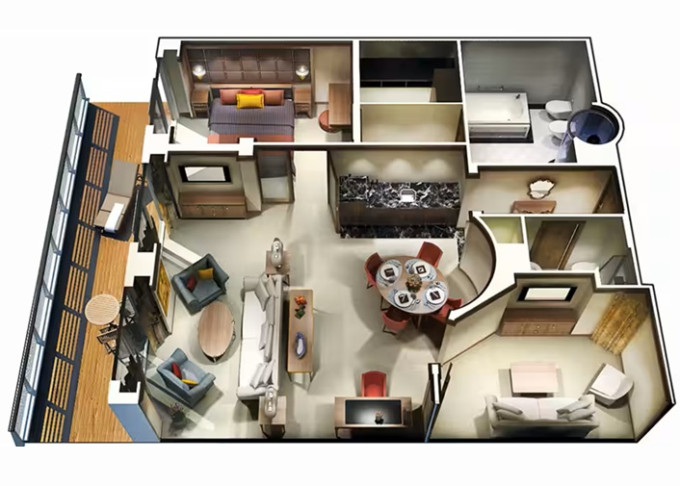 VS - Vista Suite od 87 m² + balkón od 24 m². 8. až 10. paluba. Max 2-3 osoby. 3 izby: spálňa, veľká obývacia miestnosť s jedálenskou časťou, zariadená fitness miestnosť, 2 kúpeľne (1 s vírivkou), šatník. Výhody Vista Suite. | 26 678 € 13 339 € za osobu | ||