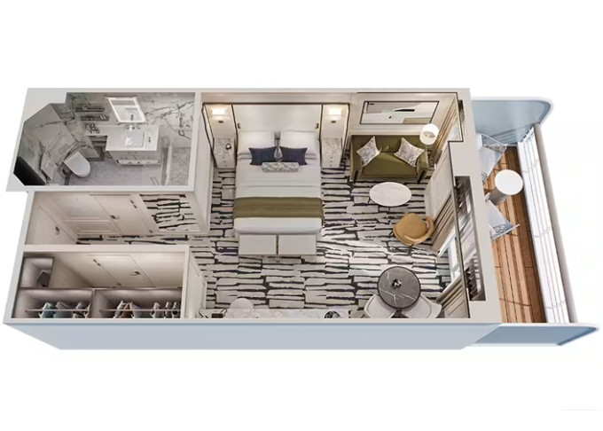 A3 - Kajuta s balkónom Concierge 23 m² + balkón 4 m². 9 paluba vpredu, vzadu. Max 2-3 osoby. Výhody kategórie Concierge. | 11 338 € 5 669 € za osobu | ||