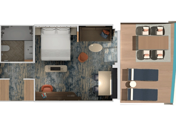 | HU - Suite Havana Cabana Corner 33 m² + vonkajšie rohové patio 15 m². 8. paluba vpredu. Max 3 osoby. Tropický štýl, vstup do exkluzívnej zóny Havana. Výhody Suite. | 5 384 € 2 692 € za osobu | ||
