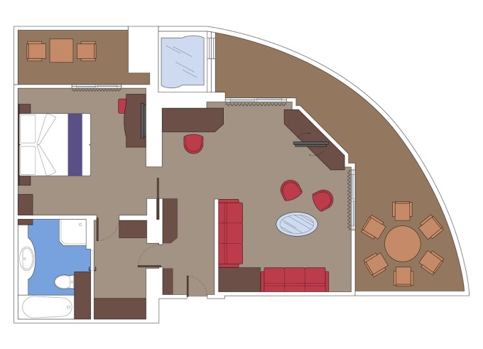 YC3 - Yacht Club Royal Suite s vírivkou 58 m² + rohový balkón s vírivkou 70 m². Oddelená obývacia časť a spálňa, šatník, kúpeľňa s vaňou a sprchou. 15. paluba. Cenový model MSC Yacht Club. | 41 404 € 10 351 € za osobu | ||