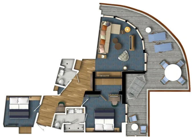 | SPNO - Panorama Suite 73-77 m² + balkón 31-36 m² so stolom, ležadlami a hojdacou sieťou. 2 spálne a 2 kúpeľne. 6,9,10. paluba. Max 6 osoby. Výhody Suite. | 9 366 € 3 122 € za osobu |